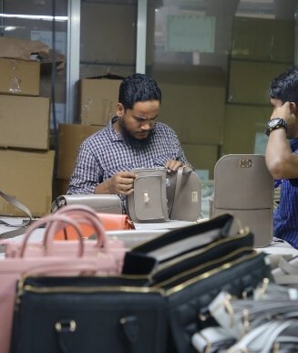 The hides are cut and inspected. The processes of skiving, gluing, sewing, and other inspections are carried out to produce the products.